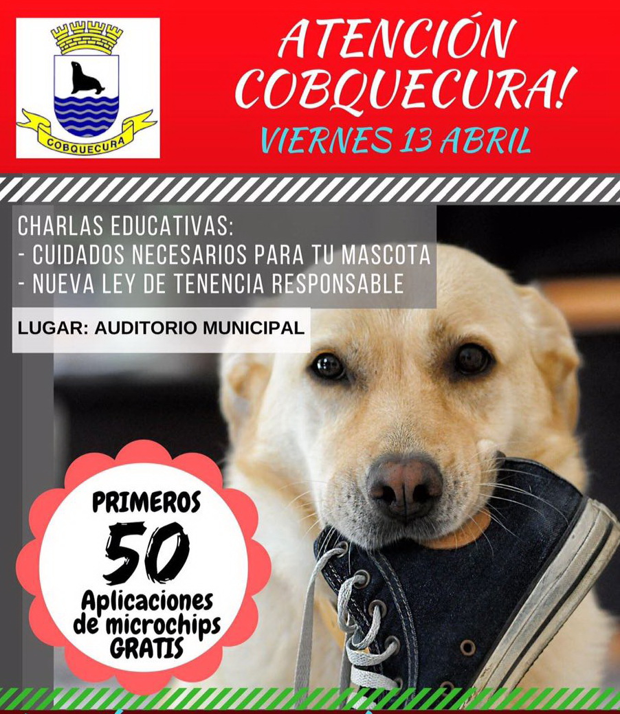«La charla se realizará a las 15 horas en el salón municipal de Cobquecura, y como una manera de incentivar la participación de,la comunidad, el municipio dispuso la entrega de microchips, que la ley exige, y que serán implantados de manera gratuita a los primeros 50 vecinos que participen previamente de la charla, lo que será requisito indispensable para optar a este beneficio«, agregó Águila.