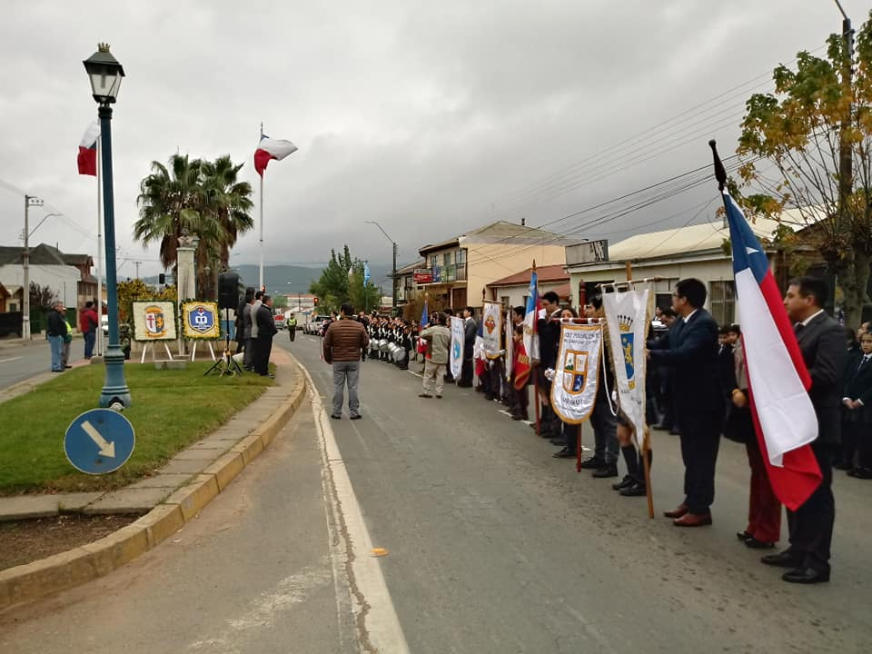 Pasadas las 11 de la mañana, se realizó el acto y posterior desfile en la plaza de armas, donde el frío se hizo sentir y con la amenaza de una llovizna que no impidió el paso de cientos de alumnos de las escuelas, el colegio y el Liceo, junto a Bomberos, los huasos, los funcionarios municipales y una delegación de la Armada.