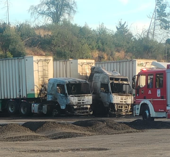 Carabineros del retén de Ñipas investiga las causas del incendio que destruyó dos camiones de transporte forestal, los cuales se encontraban estacionados en un aparcadero a la altura del kilómetro 1 de la ruta que une el sector de Nueva Aldea con la comuna de Quillón.