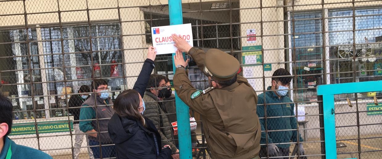 La autoridad sanitaria clausuró el taller mecánico de la empresa Antonio Castillo (Autocastillo) S.A. ubicado en Avenida O’Higgins 560, Chillán, tras constatar que el establecimiento estaba operativo en reparación de vehículos particulares.