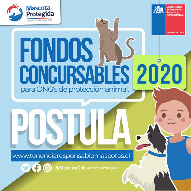 La Subsecretaría de Desarrollo Regional y Administrativo inició las postulaciones a los Fondos Concursables 2020, a través del Programa Mascota Protegida, cuyo principal objetivo es apoyar el trabajo de las organizaciones con personalidad jurídica, sin fines de lucro, promotoras de la tenencia responsable de mascotas.